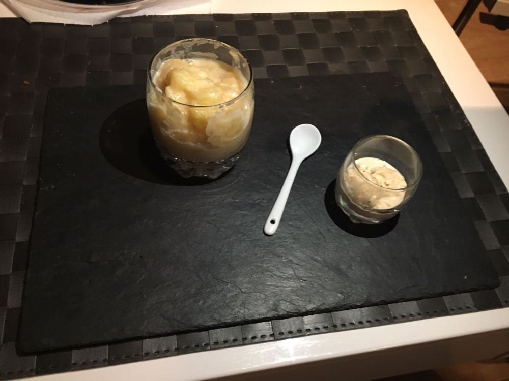 Je sers les pommes caramélisées recouvertes d’amandes et de sauce dans des verrines accompagnées d’une boule de glace vanille (je préfère une marque américaine à consonance allemande pour ne pas la citer) sur de belles ardoises pour rappeler le café gourmand.