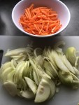 Eplucher les carottes et les pommes de terre. Couper les carottes en bâtonnets. Piquer les pommes de terre avec la pointe d’un couteau et les badigeonner d’une pincée de sel. Emincer l’oignon en lamelles.