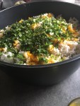 Ce plat s’accompagne avec une salade de concombre/carottes émincés avec une vinaigrette ou avec des tomates coupés en petits cubes, agrémentés de coriandre et d’une pincée de sel.