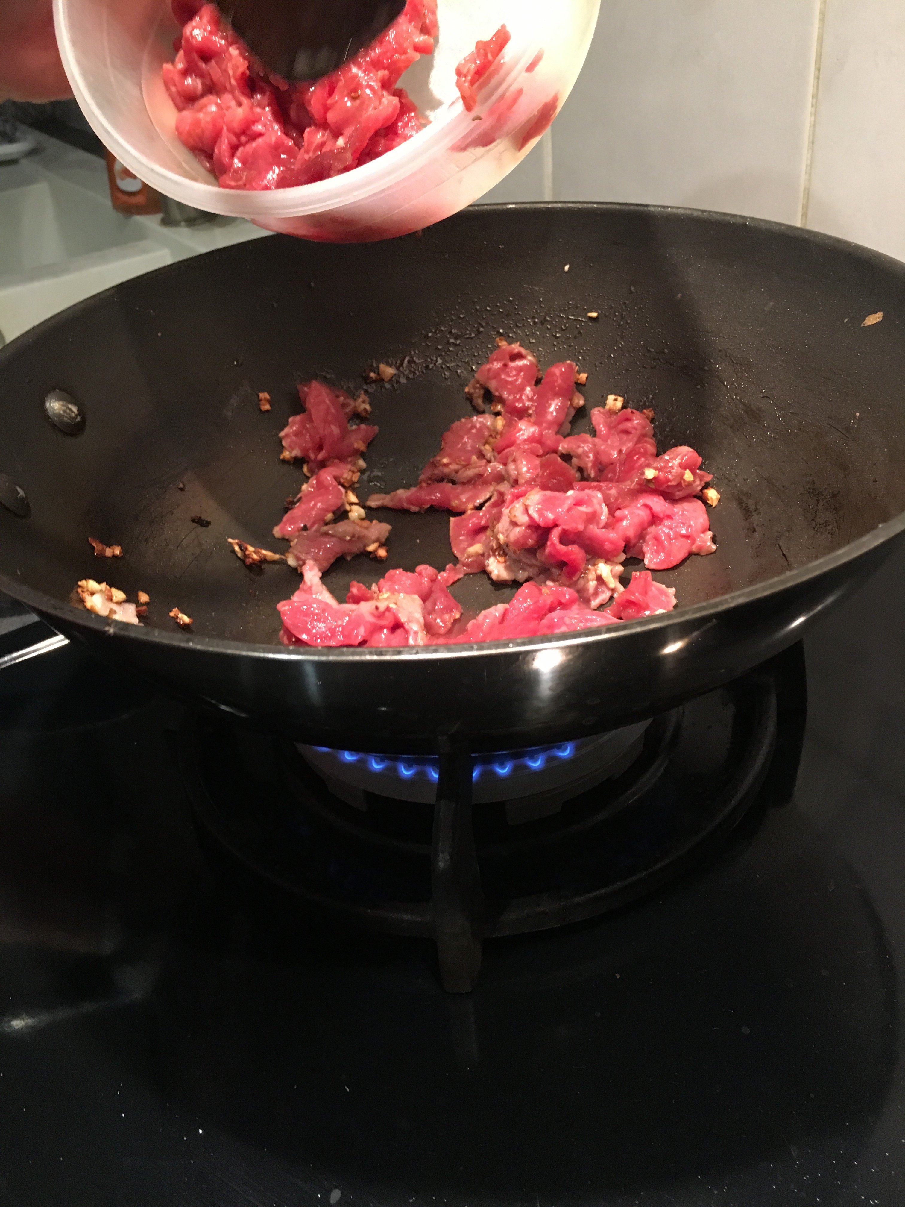 Nouilles sautées au boeuf, omelette et brocolis