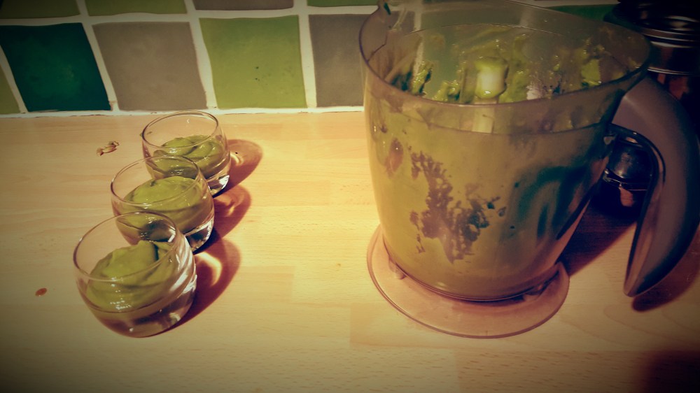 Mettre tous les ingrédients au Blender (ne pas oublier d’éplucher les avocats ;)) et servir dans les verrines. Parsemer éventuellement les zestes au-dessus des verrines. On peut réserver au frais pour un effet glacé ou déguster immédiatement.