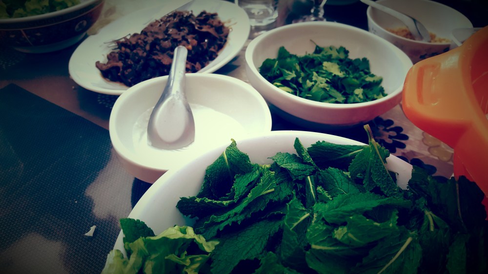 Émincer l’ail et le faire frire dans une cuillère à soupe d’huile dans un wok. Y faire cuire la viande marinée. Disposer tous les ingrédients dans un grand bol accompagné de baguettes bien sûr. Assaisonner avec la sauce nem spéciale de maman.