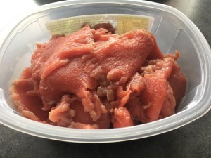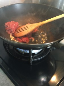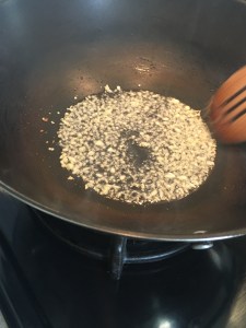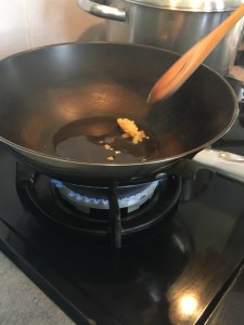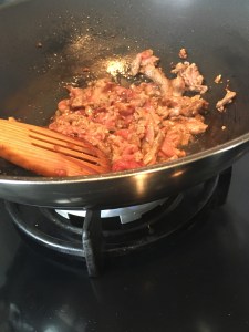 Dans une poêle ou un wok, faire dorer l’ail dans de l’huile chaude. Mettre la viande et remuer. Ajuster l’assaisonnement si besoin (sel, sauce huître). Rajouter la farine de maïs dilué dans l’eau selon la consistance voulue.
