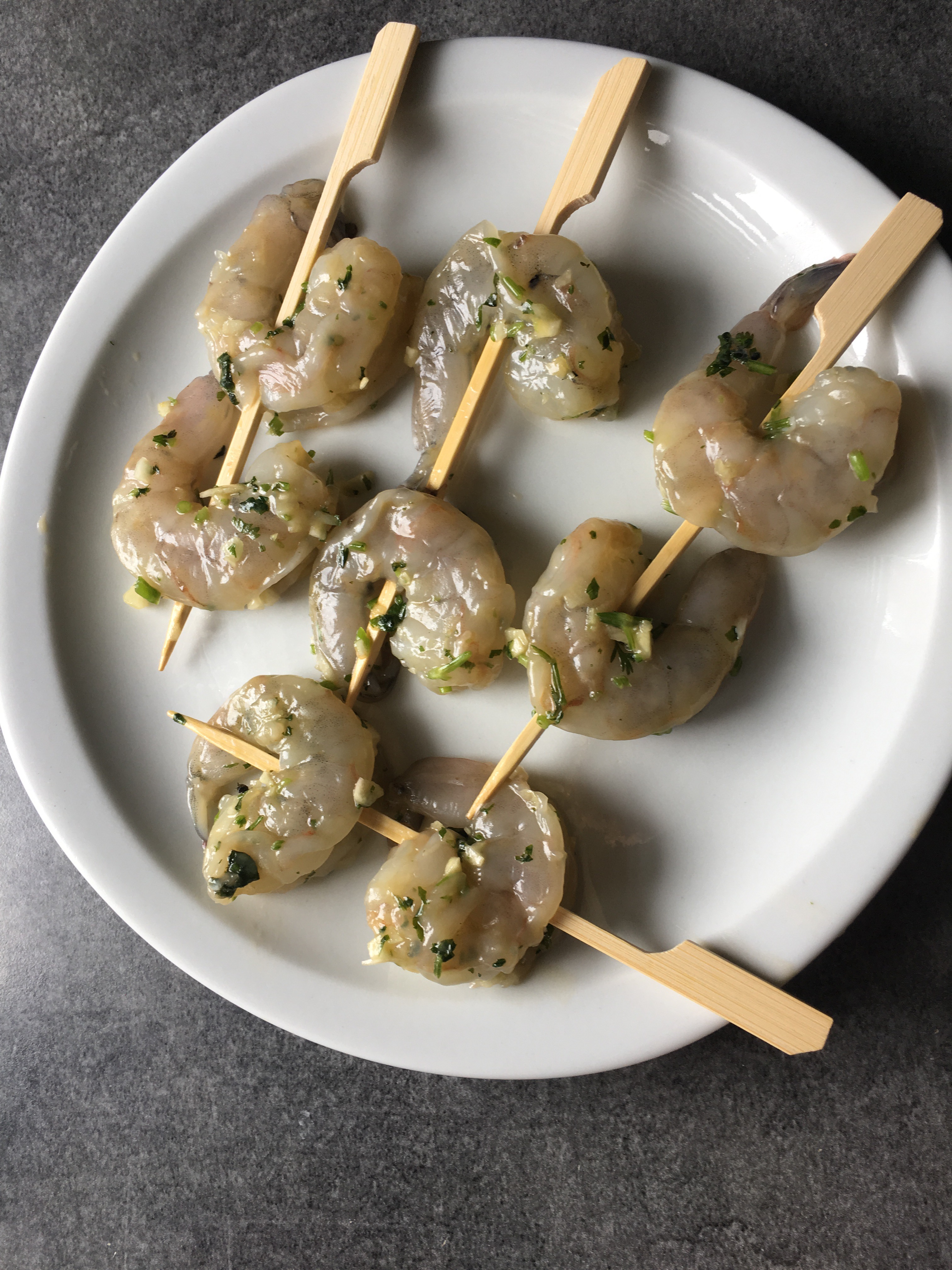 Préparer la marinade en éminçant finement la gousse d’ail et la coriandre.Ajouter un filet d’huile d’olive et du pastis. Mettre les crevettes dans la marinade et saler et poivrer légèrement. J’ai laissé les crevettes marinées toute une nuit mais quelques heures suffisent pour les plus pressés !