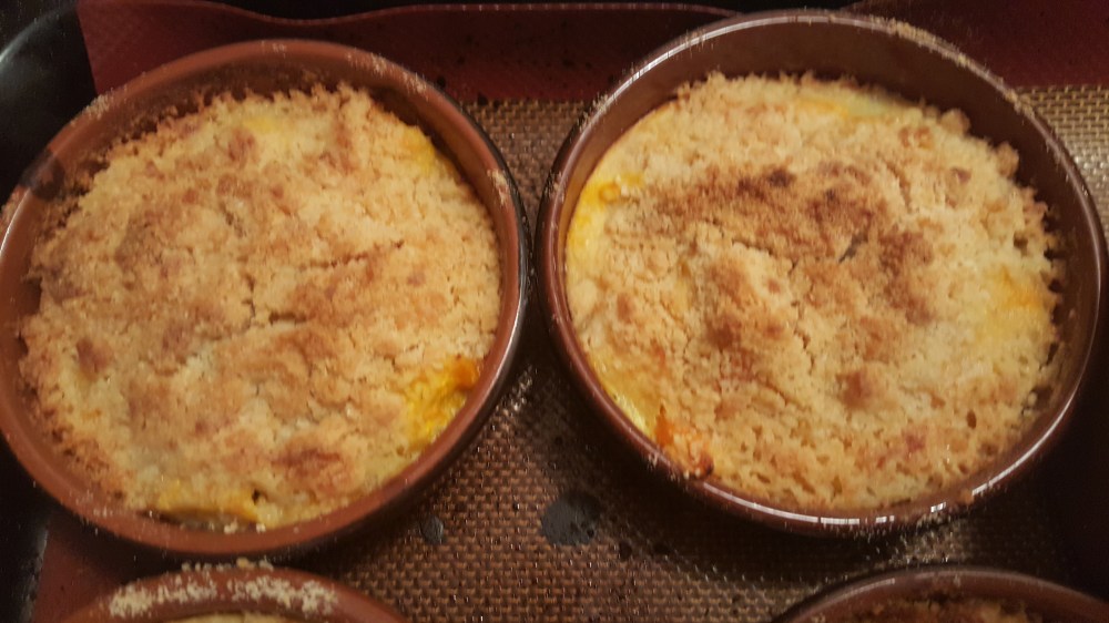 Préparer la pâte à crumble en mélangeant grossièrement avec les doigts la farine, la chapelure, le parmesan et le beurre coûpé en dés. Recouvrir les plats de cette pâte.