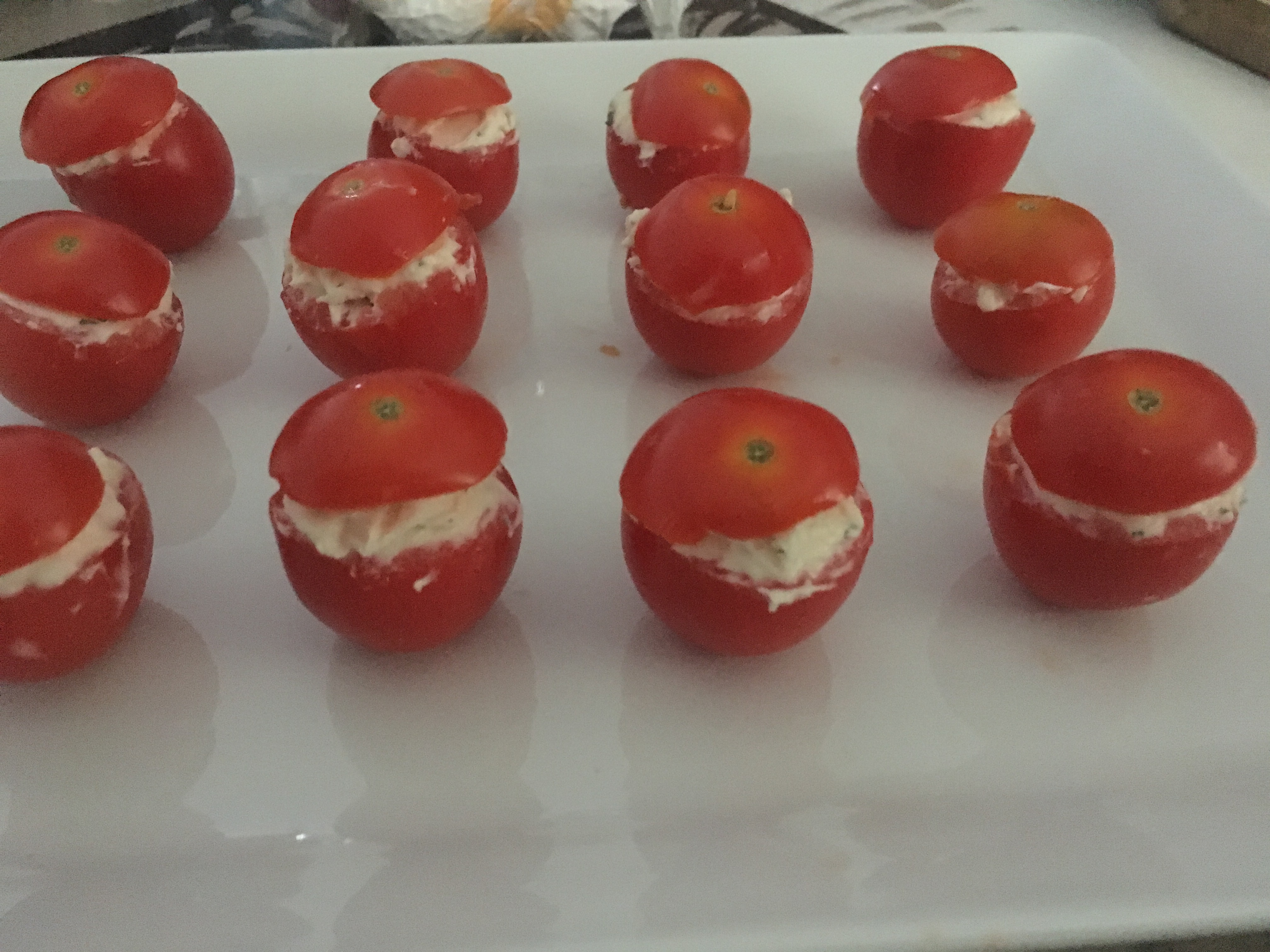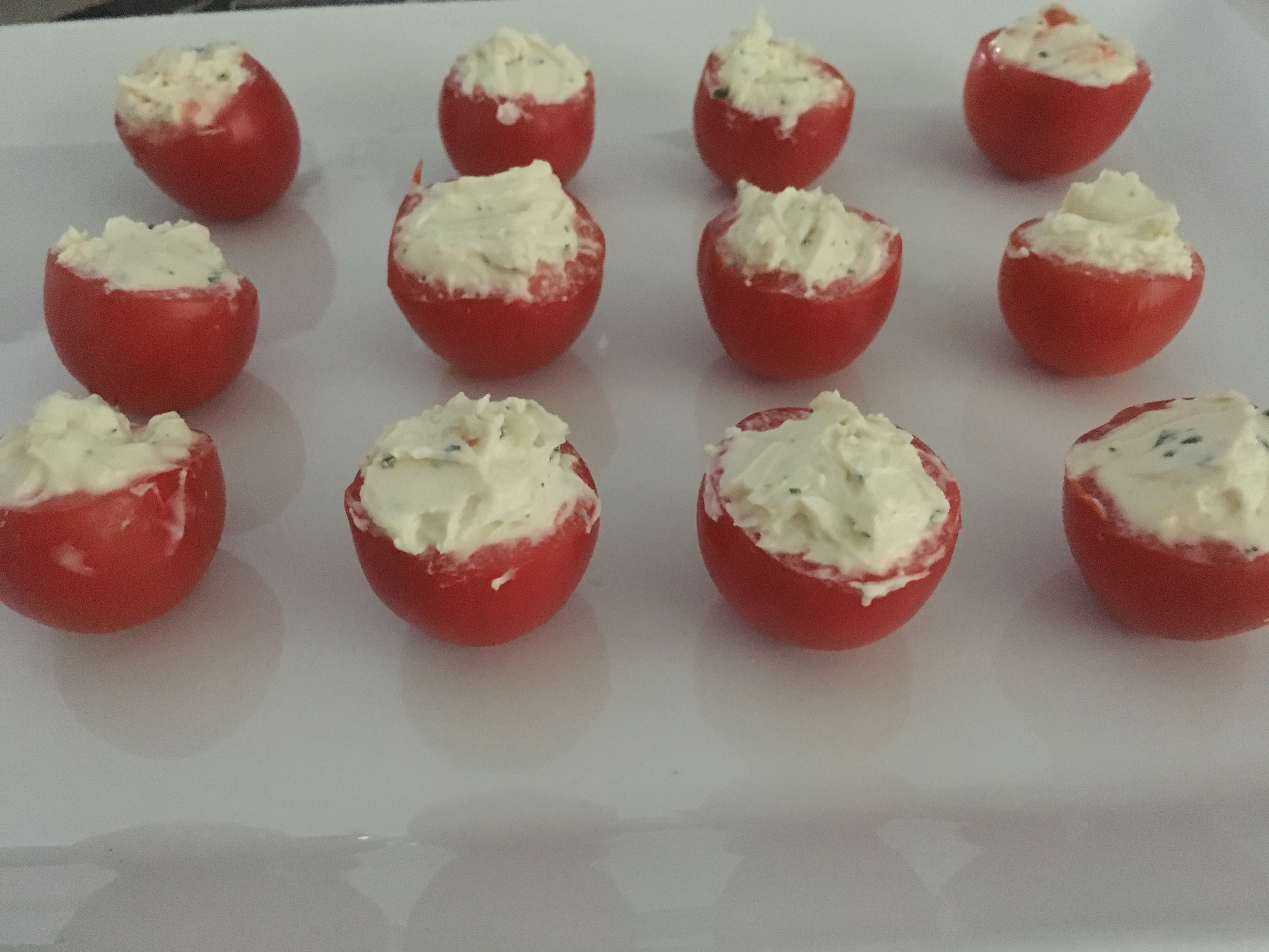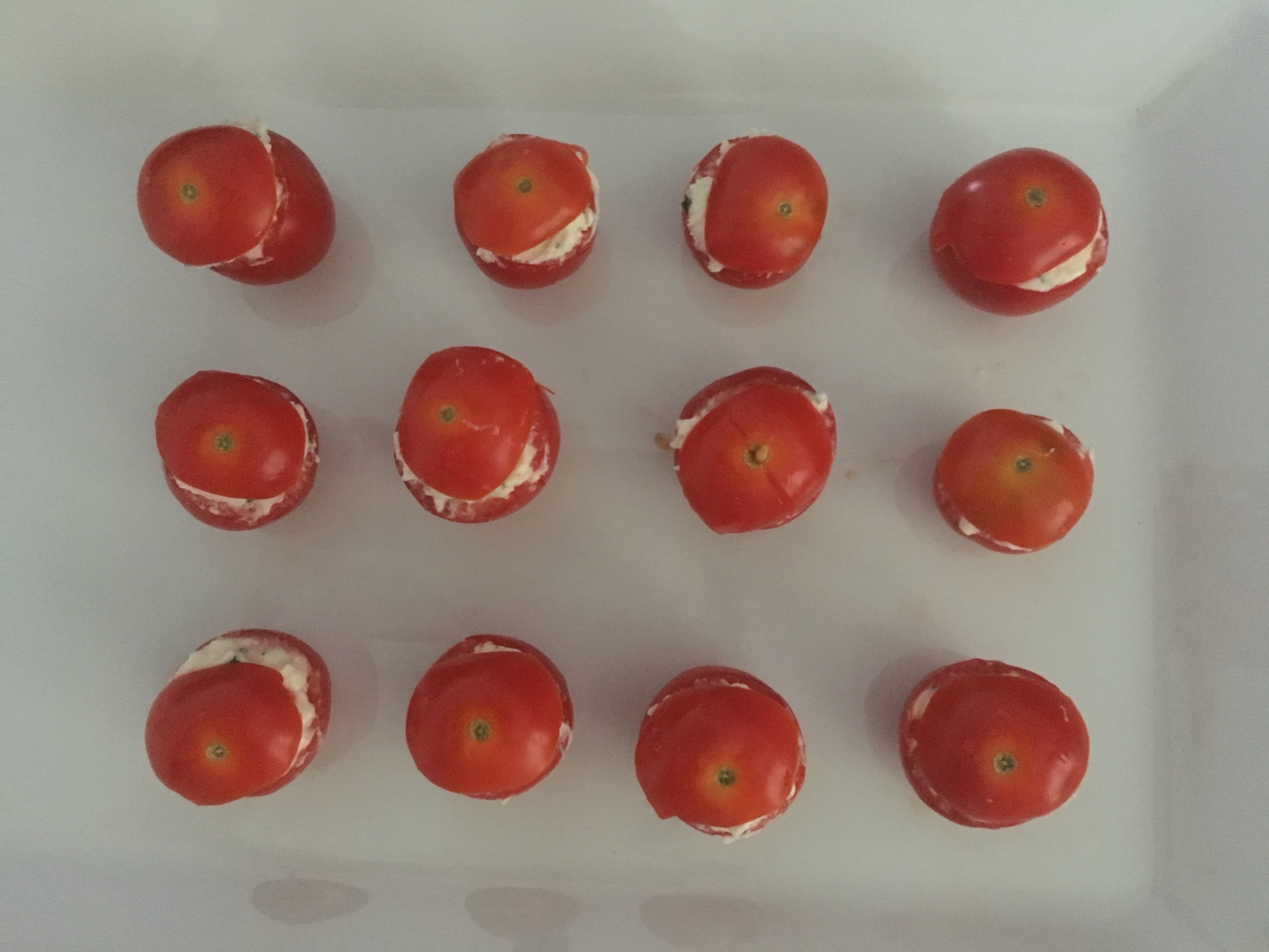 Remplir les tomates avec le fromage et remettre le chapeau. Très frais, très rapide et très simple ! Un vrai jeu d’enfant non?