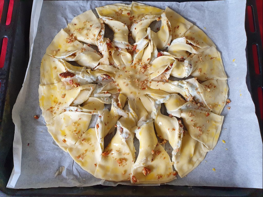 Poser un verre retourné au centre pour délimiter le cœur du soleil. Entailler la pâte au couteau pour délimiter les rayons (16 à 32 rayons). Torsader chaque rayon (pour un joli visuel, torsader un brin dans un sens, un brin dans l’autre sens, en alignant les lieux où l’on aperçoit la garniture).