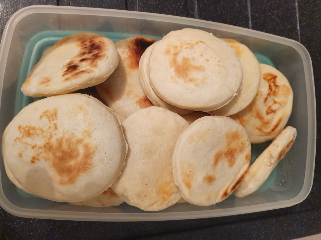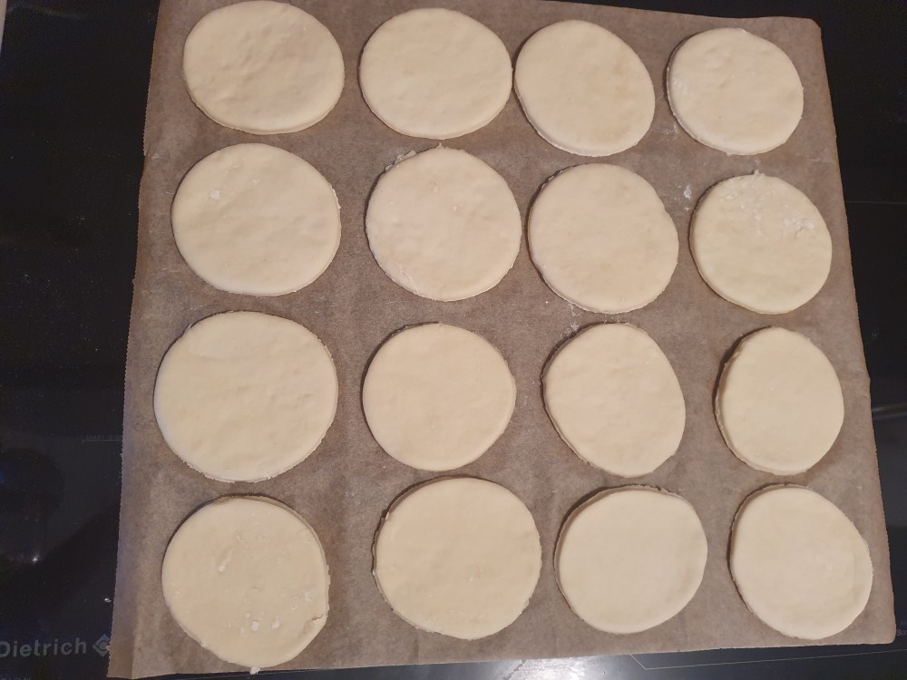 Fariner le plan de travail et étaler sur une épaisseur de 1 cm. Découper des cercles à l’aide d’un emporte pièce ou d’un verre (7 à 10 cm de diamètre). Placer les cercles sur un papier sulfurisé et saupoudrer de chaque côté de semoule de blé.