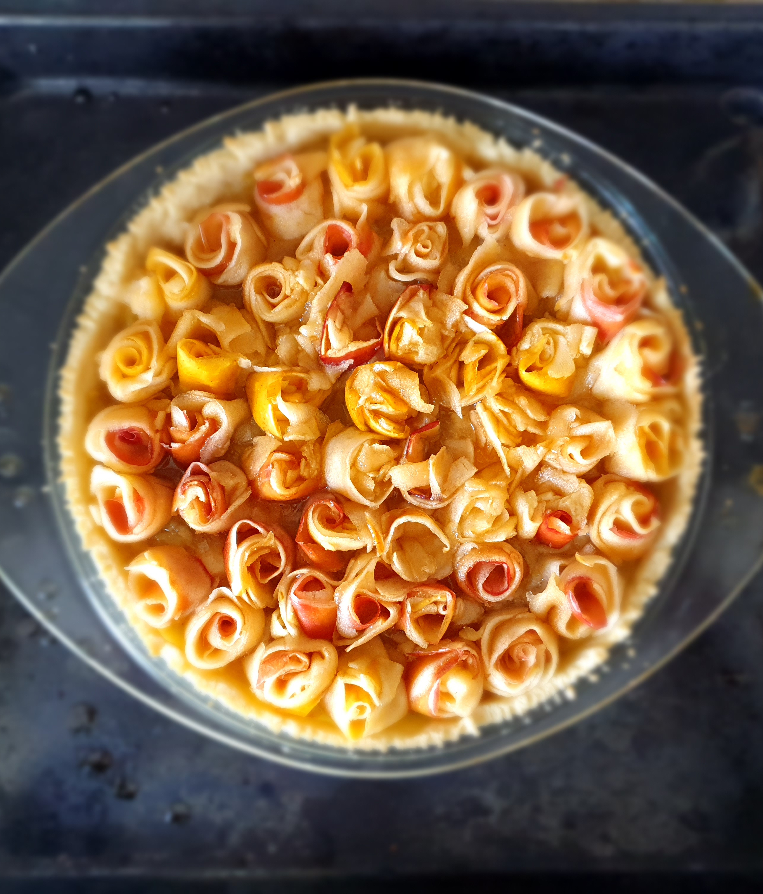 Cette recette de tarte aux pommes est inspirée de la tarte aux pommes « bouquet de roses » façon Alain Passard (la décoration s’en inspire mais la pâte feuilletée est remplacée par une pâte sucrée rustique par exemple). Il faut s’armer d’un peu de patience pour réaliser chaque fleur de pomme mais le résultat final en est la récompense.