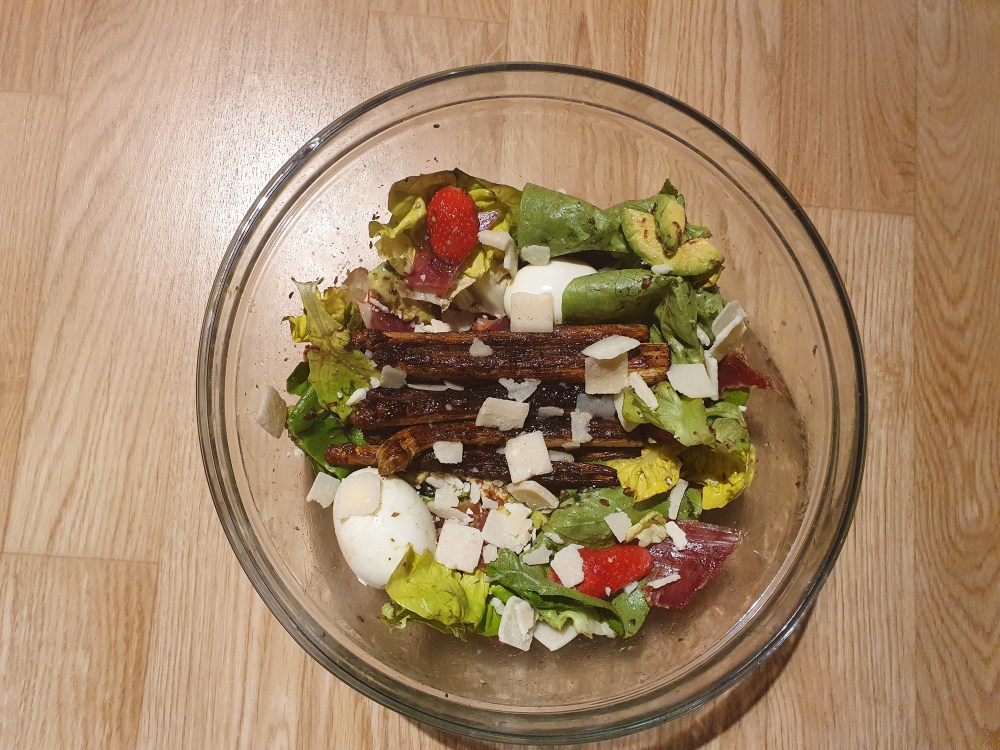 Dans un plat de présentation ou saladier, disposer les asperges rôties sur un lit de salade et de morceaux d’avocat. Parsemer de copeaux de parmesan, de fraises et de chiffonnade de jambon cru. Ajouter les œufs durs (on peut les couper en deux dans le sens de la longueur).