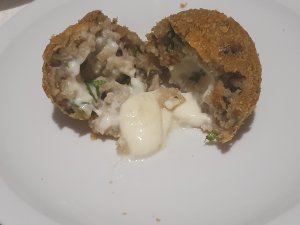 Puis, verser de la sauce béchamel puis insérer de la mozarella avant de refermer l’arancini.