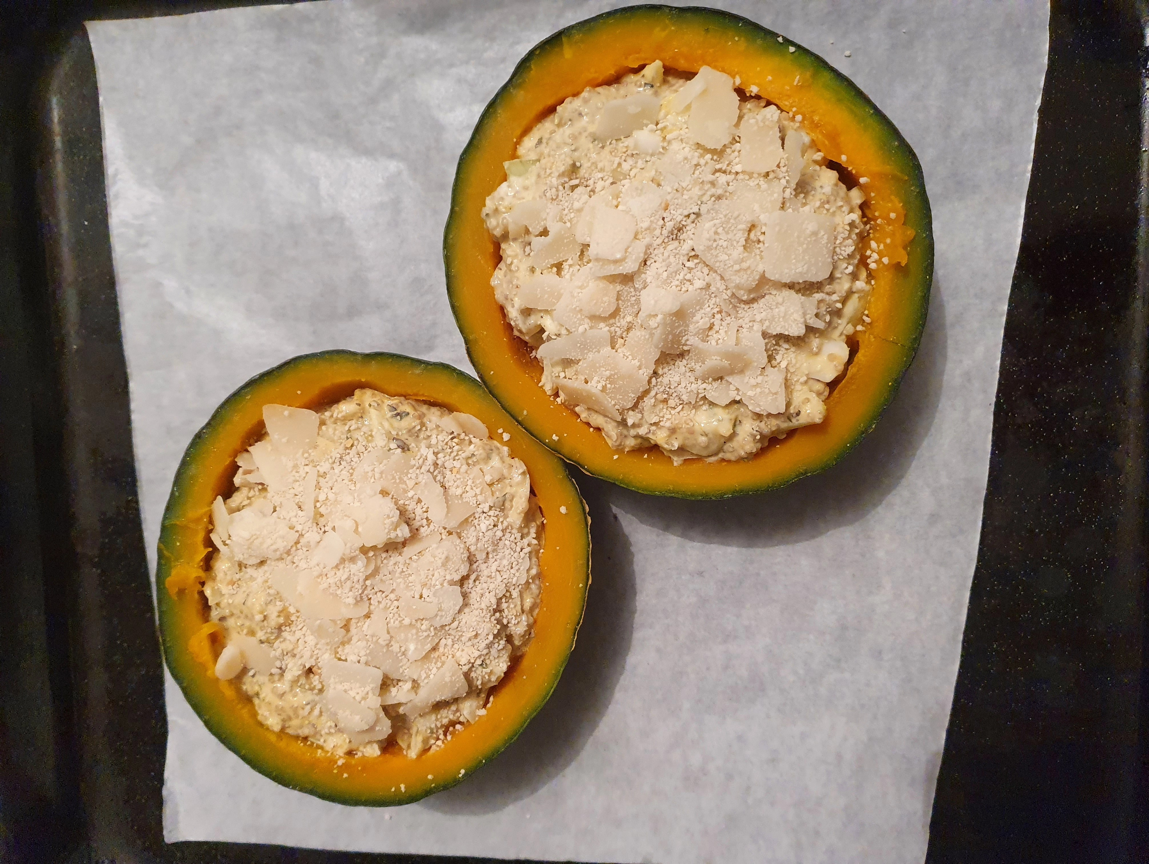 Disposer des copeaux de parmesan (et de la chapelure de mie de pain éventuellement pour faire gratiner) sur les courges et enfourner pour 10 minutes.