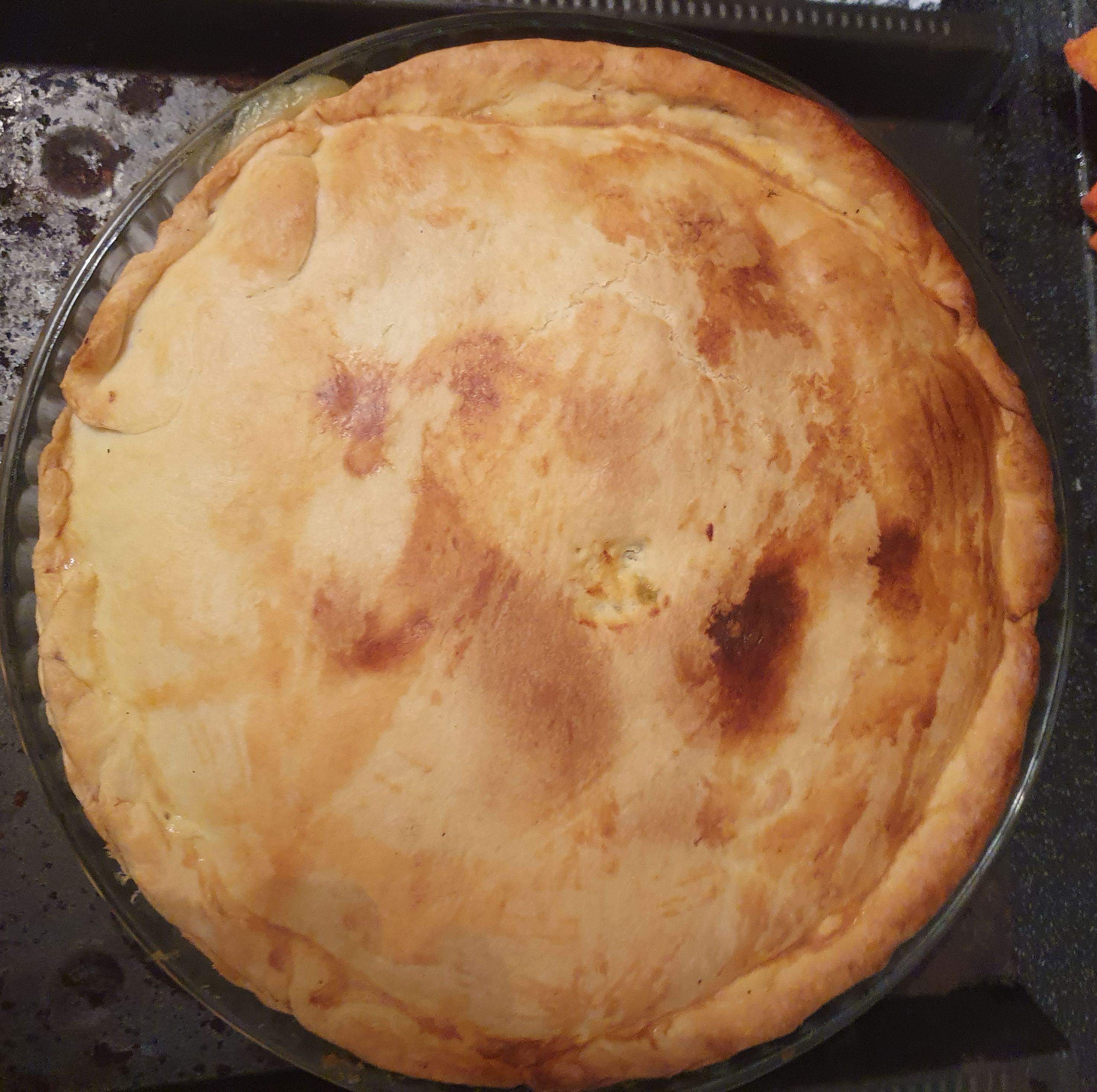 Recouvrir de la seconde pâte brisée. Coller les bords. Badigeonner au pinceau avec l’œuf mélangé à un peu de lait. On peut faire un décor sur le dessus de la tourte comme pour une galette des rois si on le souhaite. Faire une petite cheminée au centre (je fais un petit trou avec un couteau) pour laisser échapper la vapeur.