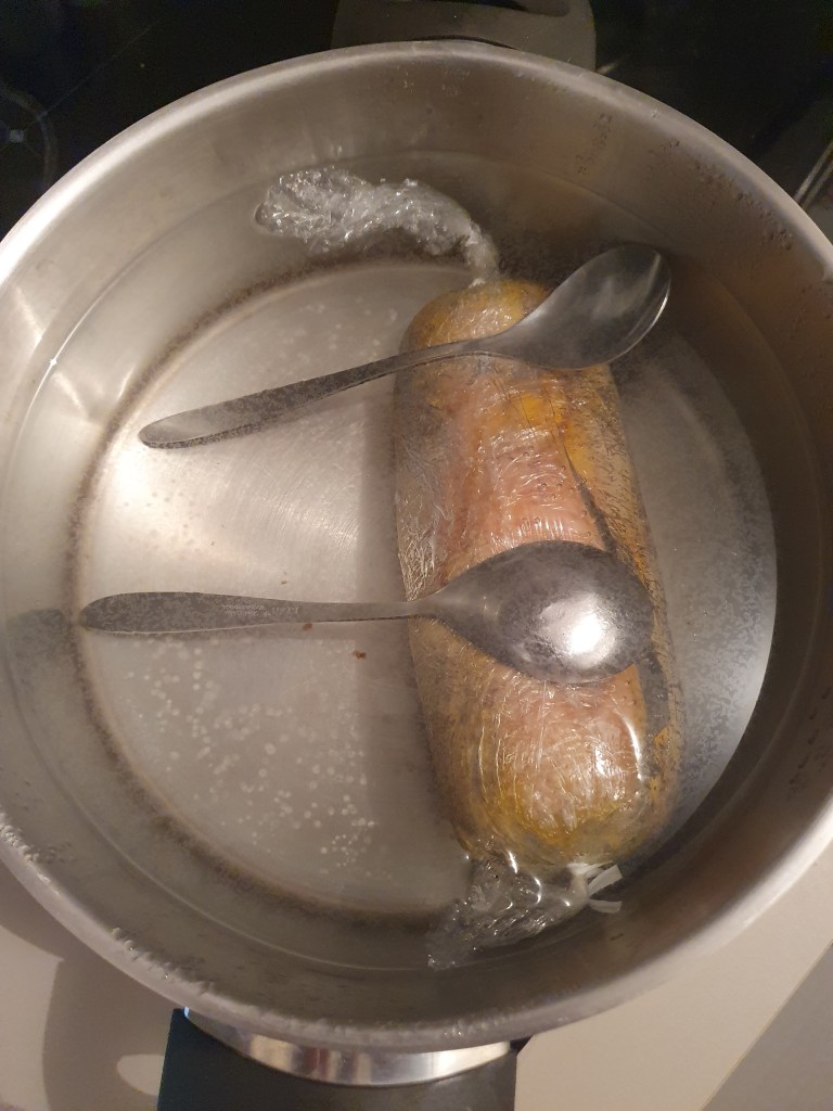 Dans une marmite ou cocotte avec couvercle, porter de l’eau à ébullition. Plonger le foie dix minutes (le temps de cuisson m’avait paru court mais cela a parfaitement fonctionné) dans l’eau chaude, hors du feu (je me suis aidé de cuillères pour le maintenir sous l’eau) avec couvercle.